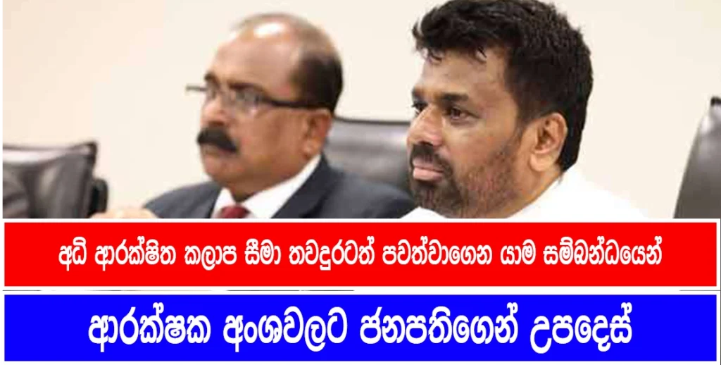 දැනට පවතින අධි ආරක්ෂිත කලාප සීමා තවදුරටත් පවත්වාගෙන යාම සම්බන්ධයෙන් නැවත පරීක්ෂා කර බලා අවශ්යතාවය පරිදි එම සීමා යාවත්කාලීන කිරීමට පියවර ගන්නා ලෙස ජනාධිපති අනුර කුමාර දිසානායක මහතා විසින් ආරක්ෂක අංශවලට උපදෙස් ලබාදී තිබේ.