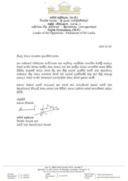 විපක්ෂ නායක සජිත් ප්රේමදාස මහතා විසින් මාධ්ය වෙත නිකුත් කළ නිවේදනය පහතින්