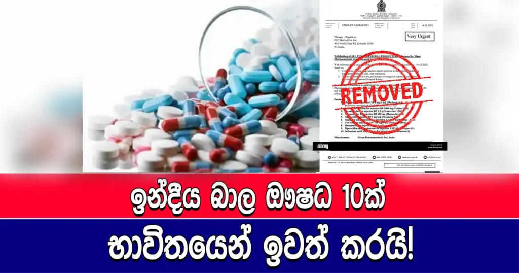 සෞඛ්ය අමාත්ය නලින්ද ජයතිස්සගේ මූලිකත්වයෙන්, රජයේ රෝහල් සඳහා පාවිච්චියට ගෙන්වා ඇති ඉන්දීය බාල ඖෂධ 10ක් වහාම ක්රියාත්මක වන පරිදි භාවිතයෙන් ඉවත් කිරීමට ජාතික ඖෂධ නියාමන අධිකාරිය තීරණය කර ඇත.
