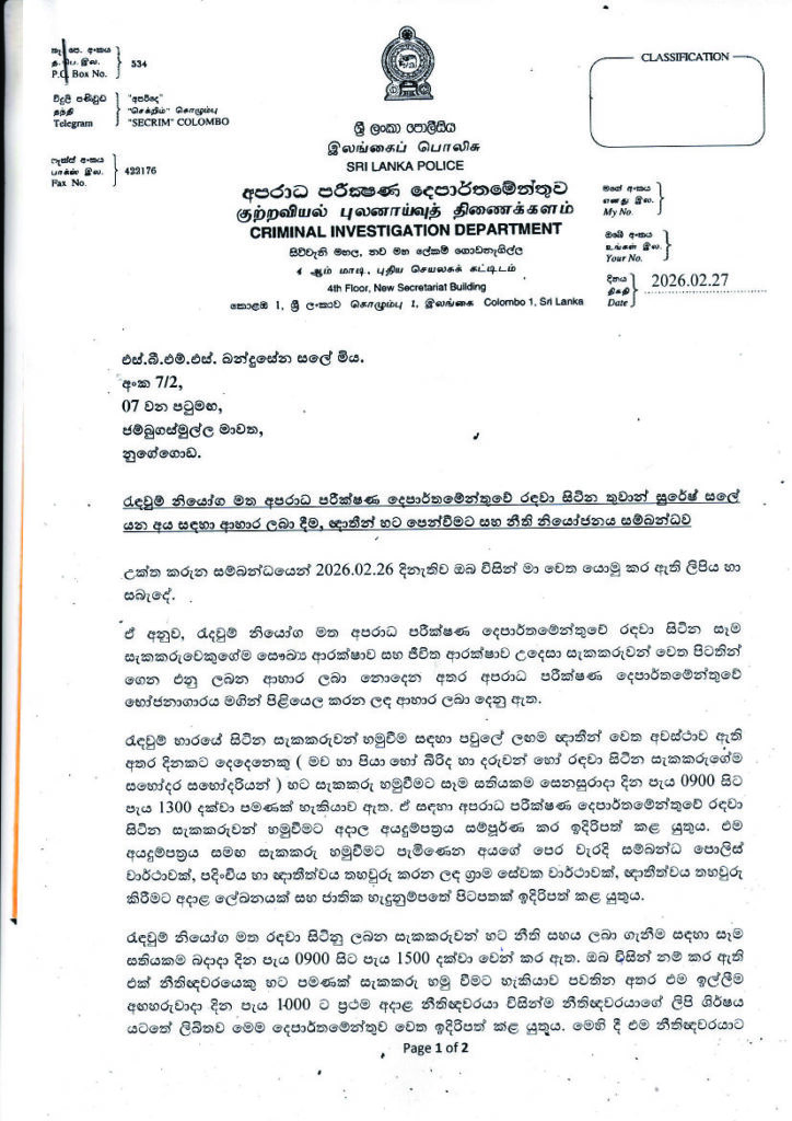 එහෙත් 2026 පෙබරවාරි 27 වැනි දිනැති පිළිතුරු ලිපියක් මගින් CID ය නිවසේ සිට ආහාර ලබාදීමට කළ ඉල්ලීම මුළුමනින්ම ප්රතික්ෂේප කර ඇත.