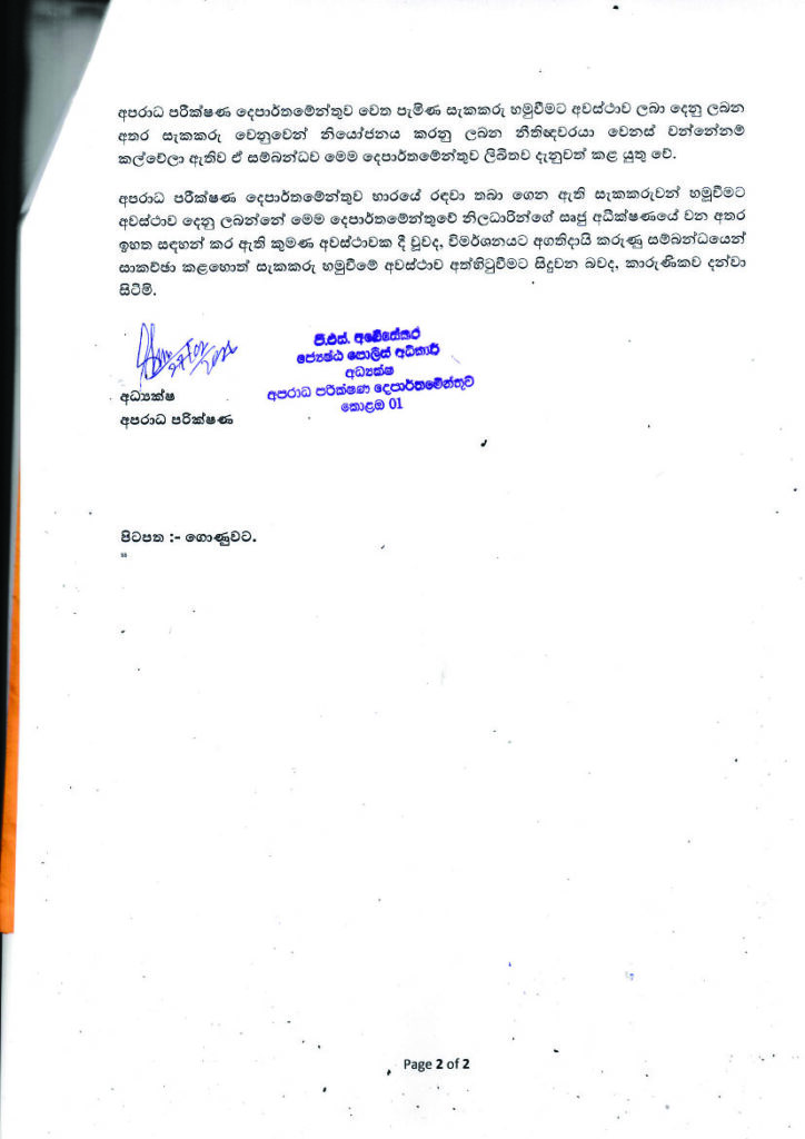 - අධිකරණය ප්රශ්න කළ අවස්ථාවේදී එහි සිටි අපරාධ පරීක්ෂණ දෙපාර්තමේන්තු නිලධාරියා (PC 85967) ප්රකාශ කර ඇත්තේ මේජර් ජෙනරාල් සලේ මහතා මෙතෙක් කිසිදු නඩුවක සැකකරුවෙකු ලෙස නම් කර නොමැති බවයි.