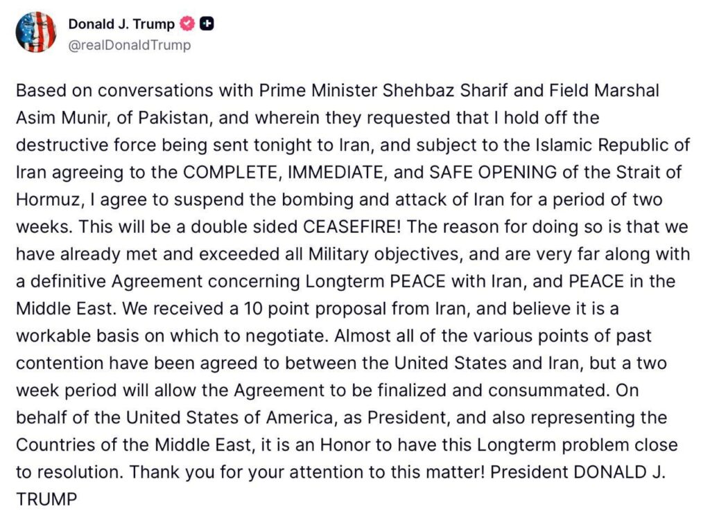 “පාකිස්ථානයේ අග්‍රාමාත්‍ය ෂෙහ්බාස් ෂරීෆ් සහ ෆීල්ඩ් මාර්ෂල් අසීම් මුනීර් සමඟ පැවැත්වූ සාකච්ඡා මත පදනම්ව, සහ අද රාත්‍රියේ ඉරානය වෙත යැවීමට නියමිතව තිබූ විනාශකාරී බලකාය නවත්වන ලෙස ඔවුන් කළ ඉල්ලීම පරිදි, ඉරාන ඉස්ලාමීය ජනරජය හෝර්මුස් සමුද්‍ර සන්ධිය සම්පූර්ණයෙන්ම, වහාම සහ ආරක්ෂිතව විවෘත කිරීමට එකඟ වීමට යටත්ව, ඉරානයට එල්ල කරන බෝම්බ හෙළීම් සහ ප්‍රහාර සති දෙකක කාලයකට අත්හිටුවීමට මම එකඟ වෙමි. මෙය දෙපාර්ශ්වීය සටන් විරාමයක් වනු ඇත. මෙසේ කිරීමට හේතුව නම්, අප දැනටමත් සියලුම මිලිටරි අරමුණු සපුරා සහ ඒවා ඉක්මවා ගොස් ඇති අතර, ඉරානය සමඟ දිගුකාලීන සාමය සහ මැදපෙරදිග සාමය පිළිබඳ ස්ථීර ගිවිසුමකට එළඹීමට බොහෝ දුරට සමීප වී සිටීමයි. අපට ඉරානයෙන් කරුණු 10 ක යෝජනාවක් ලැබී ඇති අතර, එය සාකච්ඡා සඳහා ක්‍රියා කළ හැකි පදනමක් බව විශ්වාස කරමු. අතීතයේ මතභේදයට තුඩු දුන් කරුණු සියල්ලටම පාහේ එක්සත් ජනපදය සහ ඉරානය අතර එකඟතාවයකට පැමිණ ඇති නමුත්, මෙම සති දෙකක කාලය ගිවිසුම අවසන් කිරීමට සහ සම්පූර්ණ කිරීමට ඉඩ ලබා දෙනු ඇත. එක්සත් ජනපදයේ ජනාධිපතිවරයා ලෙස සහ මැදපෙරදිග රටවල් ද නියෝජනය කරමින්, මෙම දිගුකාලීන ගැටලුව විසඳීමට ආසන්න වීම මට ගෞරවයකි. මේ සම්බන්ධයෙන් ඔබගේ අවධානයට ස්තූතියි.”