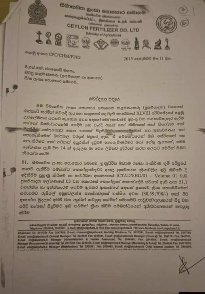 එම කාලයේදී කුමාර ජයකොඩි මහතා මෙම පොහොර සංස්ථාවේ ප්රසම්පාදන හා ආනයන කළමනාකරු ලෙස කටයුතු කල අතර, 2019. 02. 21 දින අධ්යක්ෂ මණ්ඩල පත්රිකාවක් මගින් එම සිදුවීමට අදාළ පරීක්ෂණ වාර්තාව ඉදිරිපත් කර ඇත.