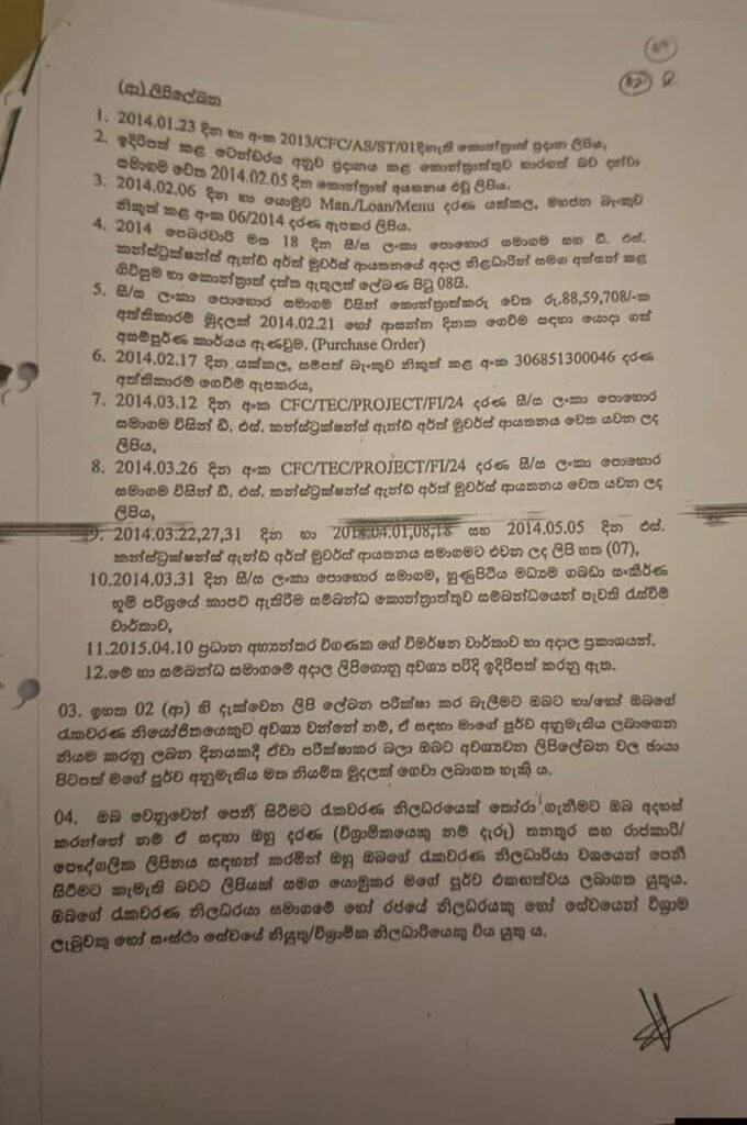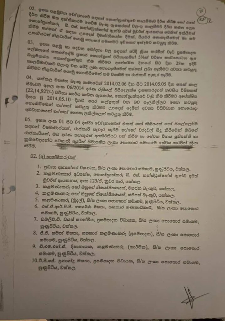 චෝදනාව 03 – කොන්ත්රාත් වටිනාකමෙන් 5% ක කර්යයසාධන ඇප බැඳුම්කරය කොන්ත්රාත්තුව නිම කිරීමෙන් පසු දින 28 කට අදාලව ලබා නොගෙන ඉහත 1, 2 චෝදනා අනුව වැඩ ප්රසම්පාදන ලේඛනයේ කොන්දේසි කඩ කරමින් වගකීම් හා රාජකාරි පැහැර හැරීම.