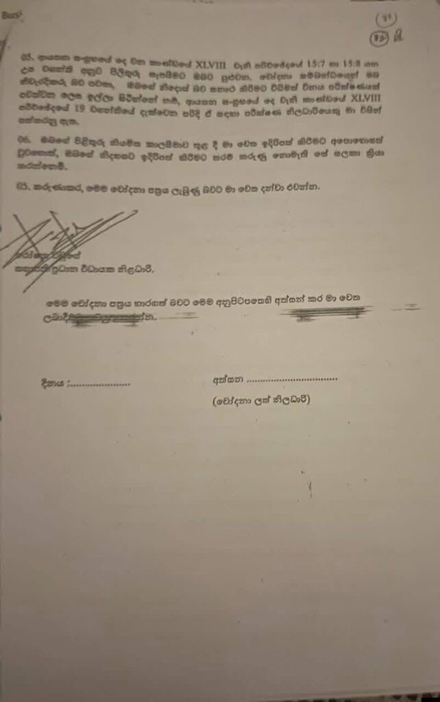 චෝදනාව 05 – ඉහත චෝදනා සියල්ල අනුව රාජකාරි පැහැර හැරීම, තනතුර අපකීර්තියට පත් කිරීම, සේවක විනය නීතිවලට පටහැනිව ක්රියා කිරීම.