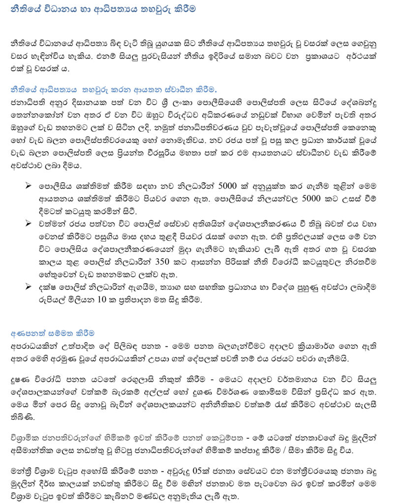 සාමාන්යයෙන් ජනාධිපතිවරයකුගේ ධුර කාලයේ වසරක ප්රගතිය පෙන්වීමේදී, මෙබදු කරුණු හුවා දක්වන්නේ නැත. කියන්න තරම් ‘‘ප්රගතියක්“ නොපවතින බැවින්, හුවා දැක්විය යුතු නැති කරුණු පවා හුවා දැක්වීමට මෙම ලේඛනය සකස් කළ පුද්ගලයන්ට සිදුව ඇති බව පැහැදිලිය.