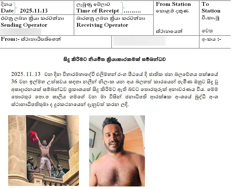 2025.11.13 වන දින විහාරමහාදේවි එලිමහන් රංග පීඨයේ දී ජාතික ජන බලවේගයේ 36 වන ඉල් මහ උත්සවය සඳහා නලින් නිලංක යන අය බලහත්කාරයෙන් පැමිණ ඔහුට සිදු වූ අසාධාරණයක් සම්බන්ධව ප්‍රකාශයක් සිදු කිරීමට ඇති බවට තොරතුරක් අනාවරණය විය. මෙම තොරතුර පො.ප. ….. වන මා විසින් ජනාධිපති ආරක්ෂක අංශයේ බුද්ධි අංශ ස්ථානාධිපතිතුමා ද දුරකථනයෙන් දැනුවත් කරල ලදී.”