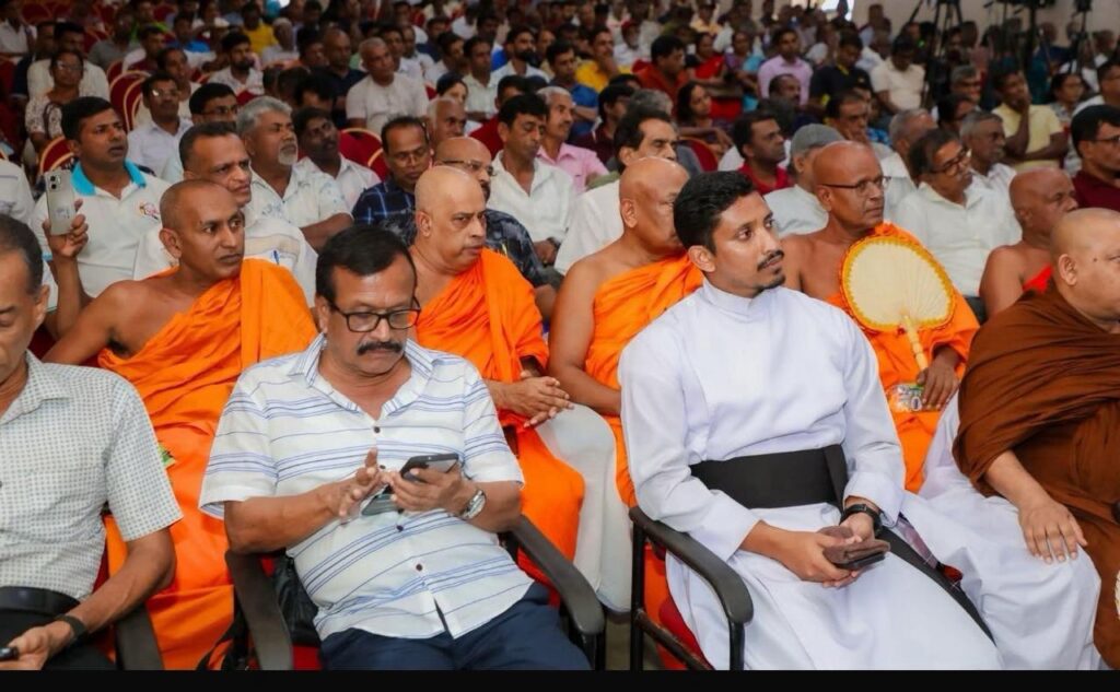මේ සිටින්නේ, ආණ්ඩුවේ උත්සවයකට ආරාධනා ලැබ පැමිණ සිටි භික්ෂූන් වහන්සේලා සහ කිතුණු පූජකතුමෙකු ඇතුළු ගිහි පිරිසකි. භික්ෂූන් වහන්සේලා කොටසක් මෙහි වැඩ සිටින්නේ ගිහියන්ට පිටුපසිනි. අපේ රටේ ඓතිහාසික සම්ප්‍රදායට අනුව එනම් මහා සම්මතයට අනුව එය එසේ විය හැකි නොවේ.