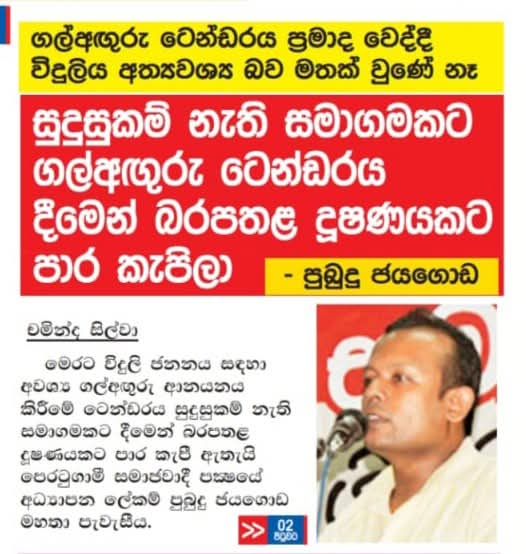 විදුලිය අත්‍යවශ්‍ය සේවාවක් ලෙස ගැසට් කරන ජනාධිපතිවරයාට, තම අමාත්‍ය මණ්ඩලයේ සිටින දූෂණ චෝදිතයන් සහ මේ සිදුවන මහා පරිමාණ ටෙන්ඩර් මංකොල්ලය නොපෙනීම පුදුම සහගතය. මේ පාඩුව පියවීමට හෙට දින නැවතත් විදුලි බිල වැඩි කළහොත් එහි සම්පූර්ණ වගකීම මෙම ‘ගල් අඟුරු මාෆියාව’ සහ ඔවුන්ට අනුබල දෙන දේශපාලන අධිකාරිය භාරගත යුතුය.
