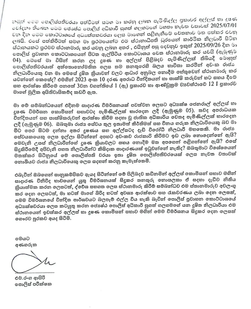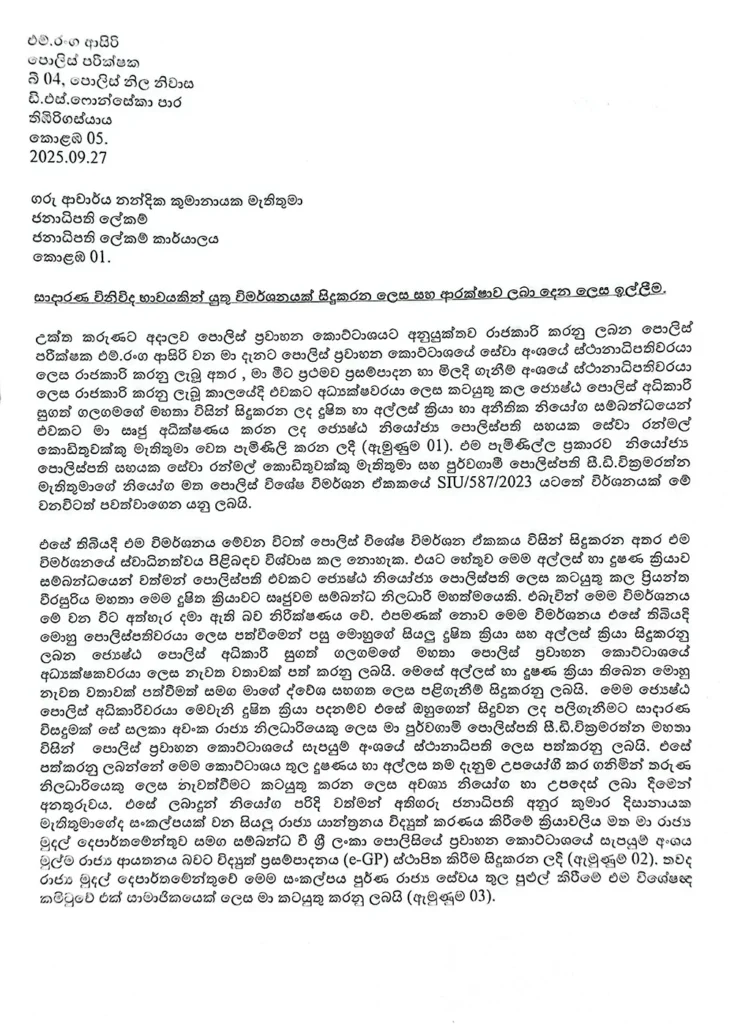 පොලිස් පරීක්ෂක රංග ආසිරි මහතා ජනාධිපති ලේකම්වරයාට යවන ලද සම්පූර්ණ ලිපිය මේ සමඟ පළකෙරේ.