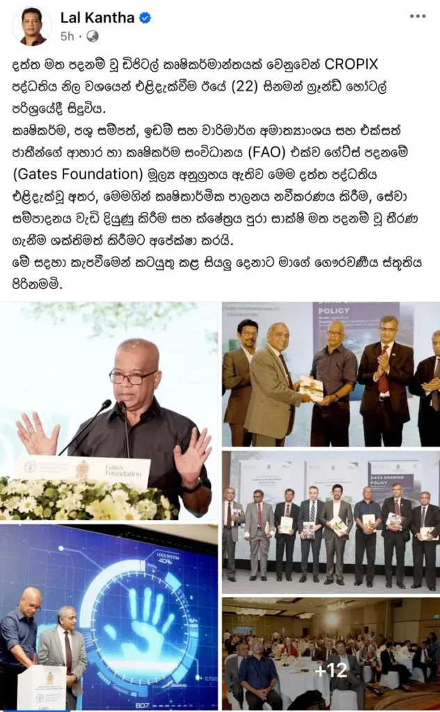 ගේට්ස් පදනමේ මූල්‍ය අනුග්‍රහය යටතේ කෘෂිකර්ම ක්ෂේත්‍රයට අයත් දත්ත ඩිජිටල්කරණයට අදාළ වැඩසටහනක් ලාල් කාන්ත ඇමතිවරයාගේ ප්‍රධානත්වයෙන්