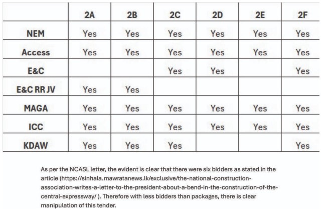 නමුත් අද හෙළි වූ ලේඛනවලට අනුව , මෙම පැකේජ 7 සඳහා ඉදිරිපත් වී ඇත්තේ සමාගම් 06ක් පමණි. සරලව කිවහොත්, එක් සමාගමකට එක් කොටසක් බැගින් බෙදා දුන්නද, අවසානයේ තවත් කොටසක් ඉතිරි වේ. මෙය ලංකා ඉතිහාසයේ එළිපිටම සිදුවූ අශීලාචාරම “වෙළඳපොළ බෙදාගැනීම” (Market Allocation) ලෙස හැඳින්විය හැක.