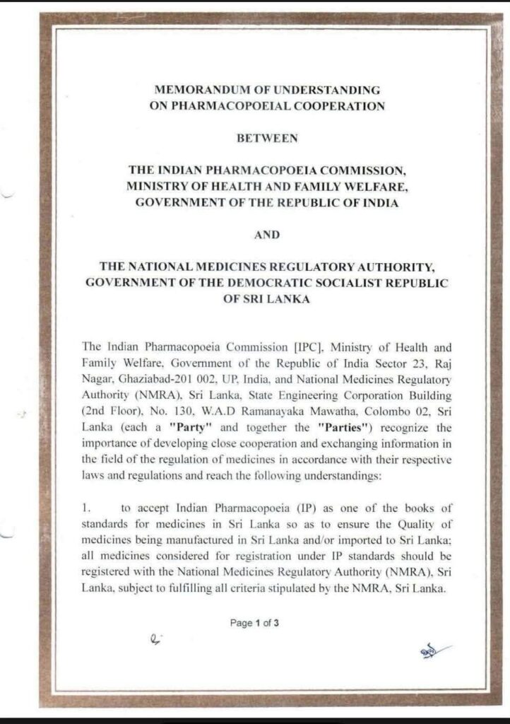 ඉන්දියාවේ නිෂ්පාදිත බාල ඖෂධ මෙරටට ගෙන එම සදහා අත්සන්තබන ලද ගිවිසුම මේ වන විට අප වෙත ලැබී තිබේ.