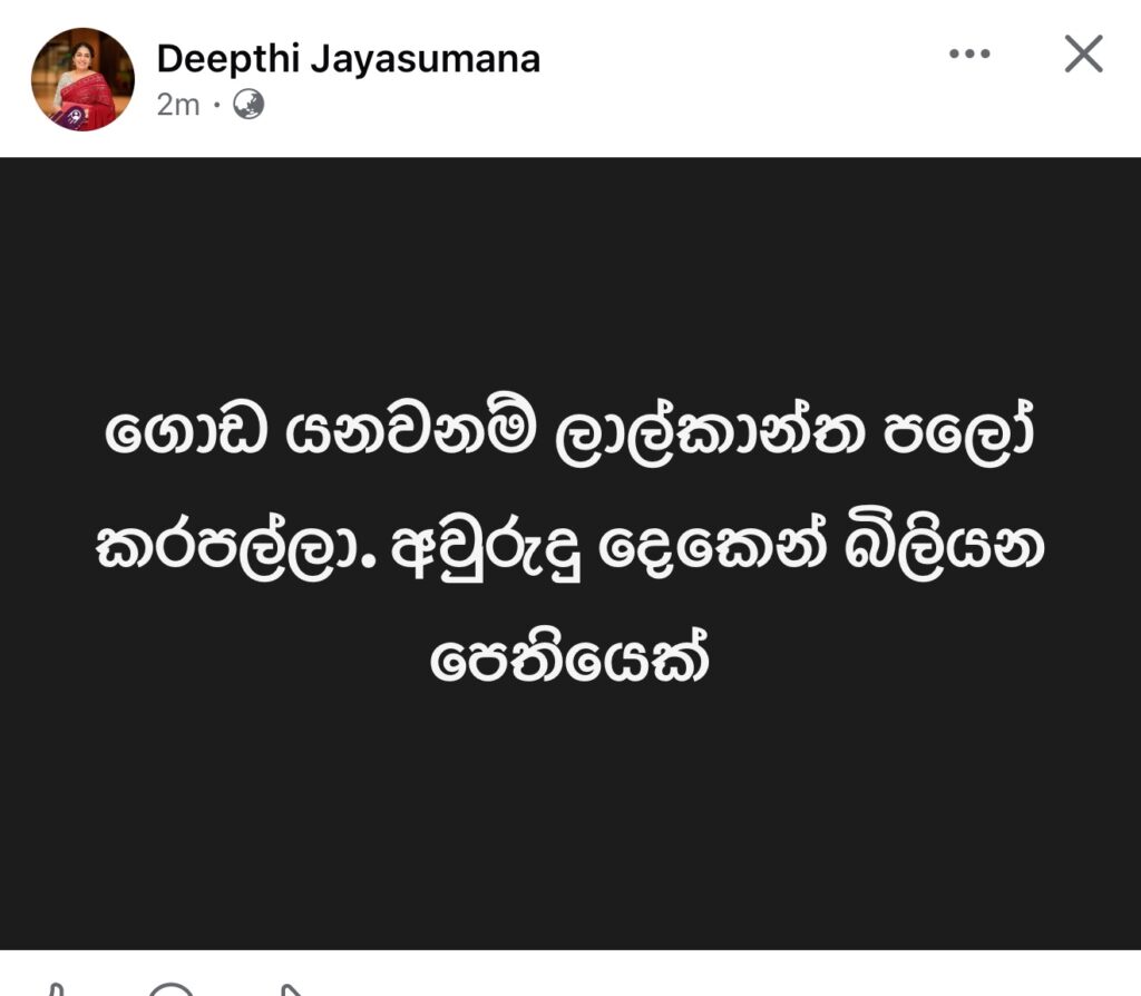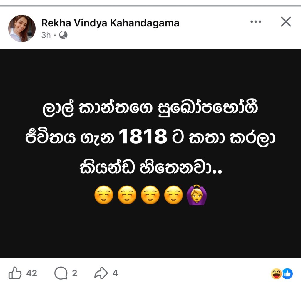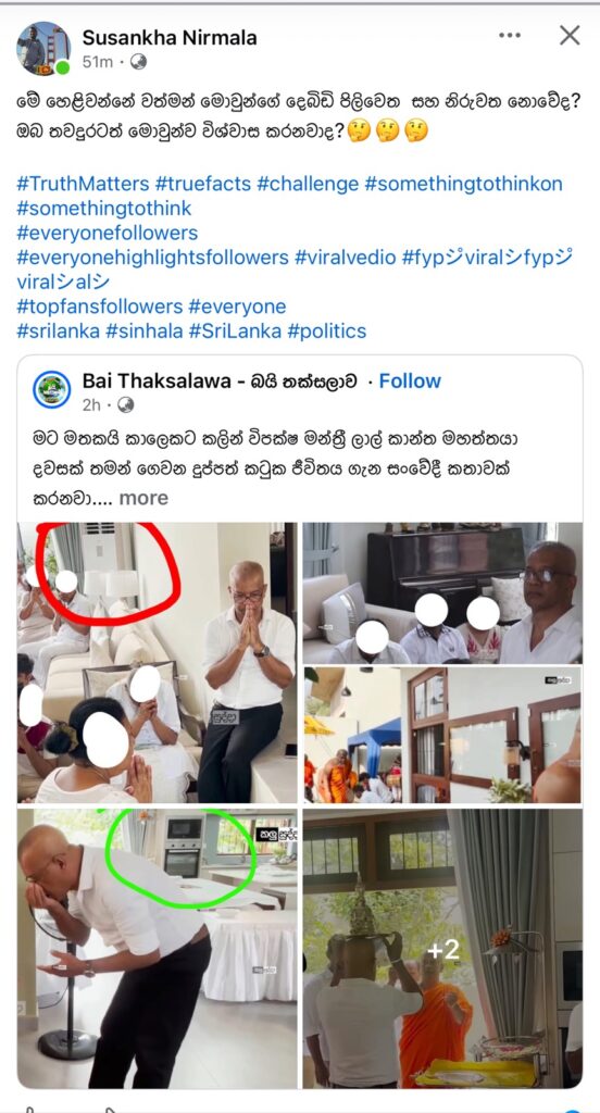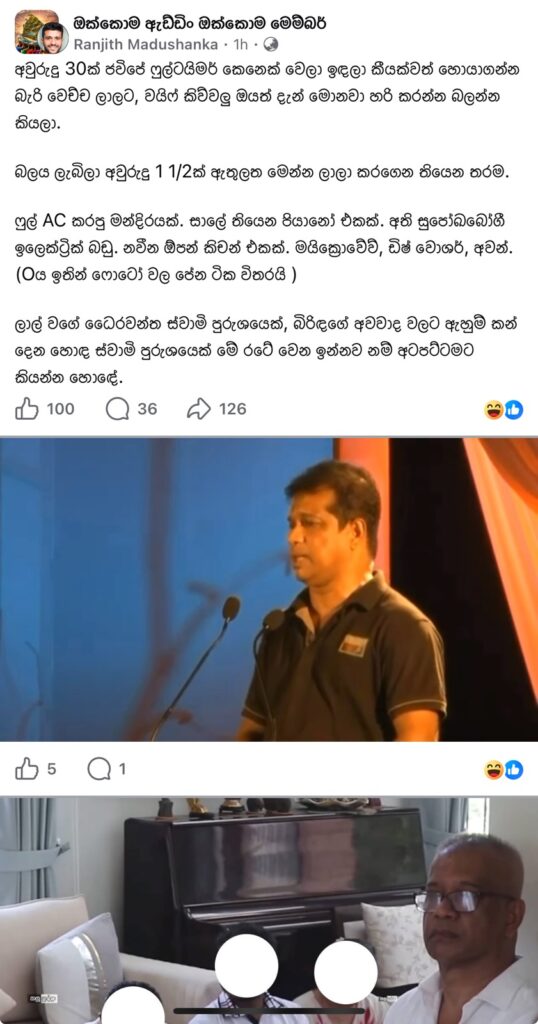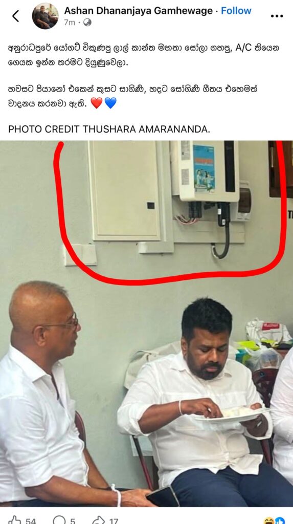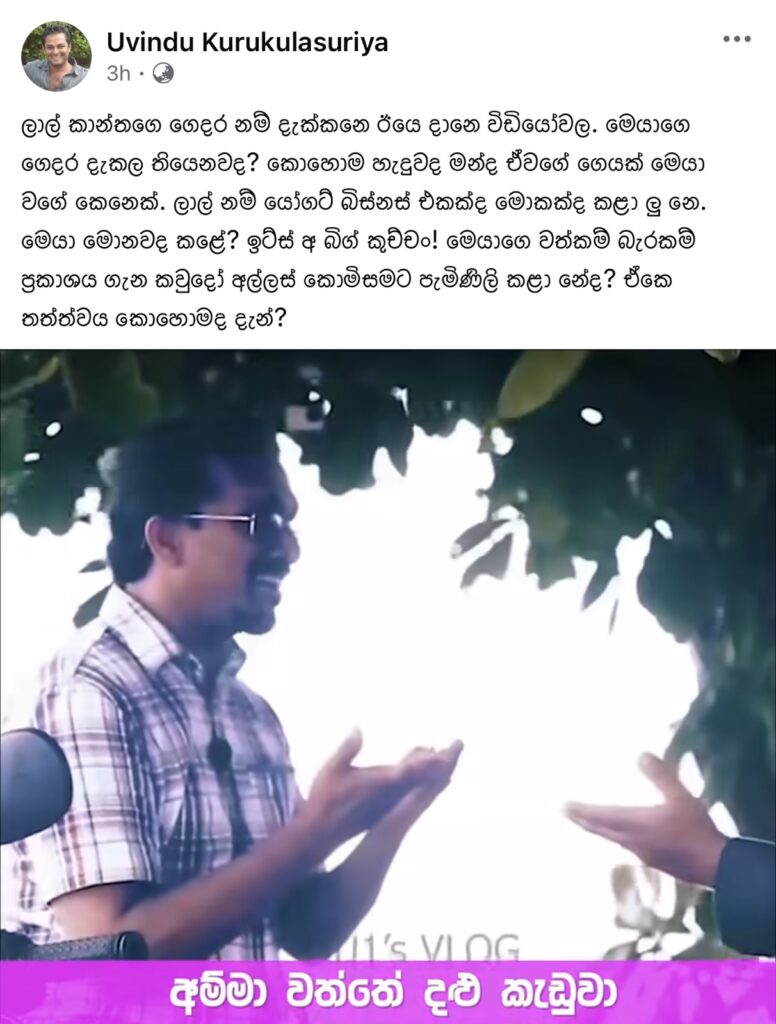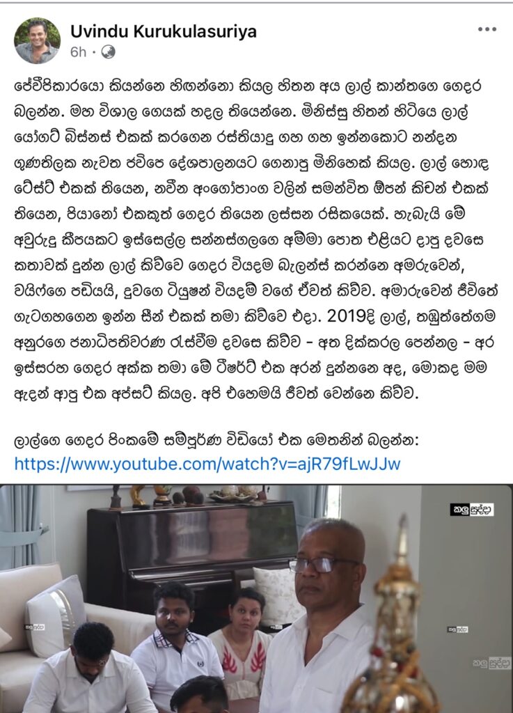 ඊයේ (31) අමාත්‍ය ලාල් කාන්ත තමන් සතු නව නිවසේ සිදු කරන ලද පින්කමක ඡායාරූප මේ වන විට බුකිය පුරා දක්නට ලැබේ. එම ඡායාරූප මගින් වායු සමීකරණය කරන ලද හා නවීන ගෘහ උපකරණ සහිත අධිසුඛෝපභෝගී නිවසක් පෙන්නුම් කෙරේ.