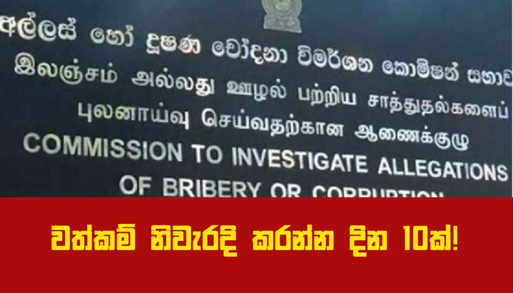 ආණ්ඩුවේ මැති – ඇමතිවරු ලබා දී තිබෙන වත්කම් ප්රකාශ හි පවතින බරපතළ අඩු පාඩු හා දුර්වලතා නිවැරදි කර ගැනීමට දින 10ක කාලයක්, අල්ලස් හෝ දූෂණ විමර්ශන කොමිෂම විසින් ලබාදී තිබේ.