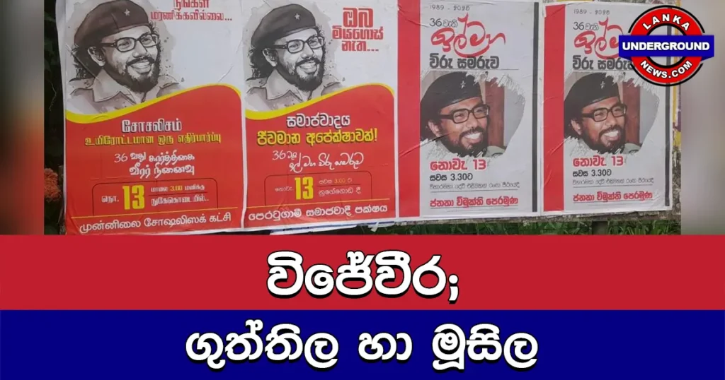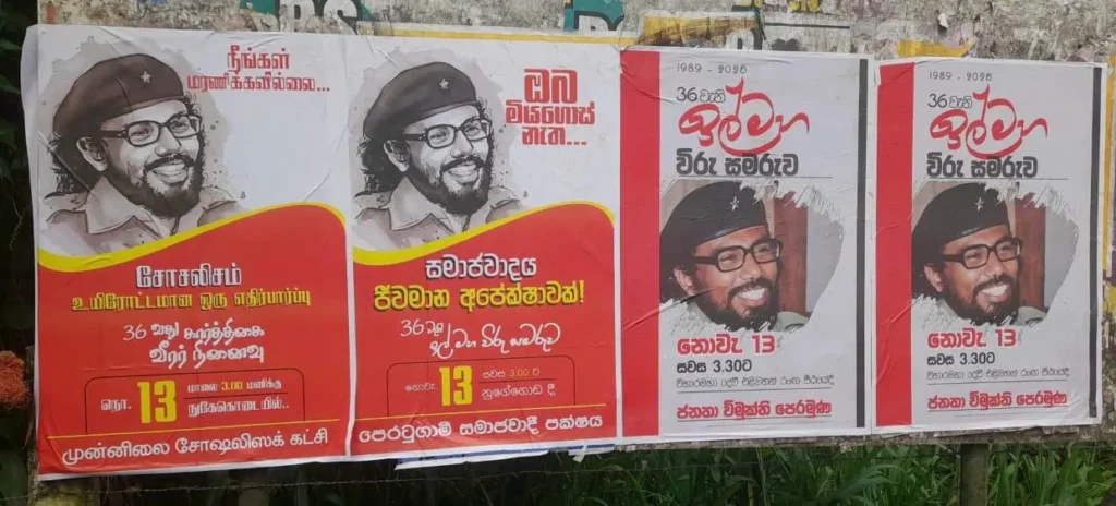 දැන් අප යන්නේ ඉහත දක්වා ඇති ඡායාරූපය වෙතට ය. අප ඉහත අර්ථ දැක් වූ විජේවීර සමරන්නට ප්‍රසිද්ධියේ කටයුතු කරන පක්ෂ දෙකේ පෝස්ටර් එහි දක්නට ඇත. එකක් ජනතා විමුක්ති පෙරමුණ ය. අද එය 13 වැනි සංශෝධනය පූර්ණව ක්‍රියාත්මක කිරීමට එකඟ ය. එනම්, විජේවීර කී “…දෙමළ ඊළම් දිශාවට පළමු පියවර වශයෙන් ෆෙඩරල් ක්‍රමයක් බිහි කිරීමට ද…” එකඟ ය. අනෙක් පක්ෂය වන්නේ පෙරටුගාමී සමාජවාදී පක්ෂය ය. එය, පසුකාලීනව බිහි වූ ජ.වි.පෙ. න් කැඩී ගිය වුන්ගෙන් සමන්විත පක්ෂයකි. එම පක්ෂය ද ෆෙඩරල් ක්‍රමයට එකඟ ය. මේ දෙගොල්ලන්ටම උතුරේ මිය ගිය LTTE බෙදුම්වාදී ත්‍රස්තවාදීන් විරුවෝ ය. ඒ නිසා ජ.වි.පෙ. ආණ්ඩුවේ ධීවර ඇමැති චන්ද්‍රසේකරන් තිලීපන් සමරුවට ද සහභාගී වන්නේ ය.