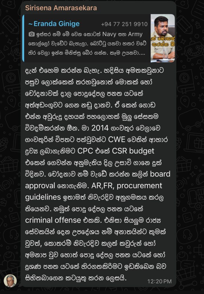 ”දැන් එහෙම කරන්න බැහැ. හදිසිය අමතක වුණාට පසුව ලොක්කෙක් තරහ වුණොත් මොකක් හෝ චෝදනාවක් දාලා පොදු දේපළ පනත යටතේ අත්අඩංගුවට ගෙන නඩු දානවා. ඒකෙන් ගොඩ එන්න අවුරුදු දහයක් පහළොවක් මුළු සේසතම වියදම් කරන්න ඕන. මා 2014 ගංවතුර වෙලාවෙ ගං වතුරින් විපතට පත්වූවන්ට CWE වෙතින් ආහාර ද්රව්ය ලබා ගැනීමට CPC එකේ CSR Budget එකෙන් ගෙවන්න අනුමැතිය දීලා උසාවි ගානේ දුක් විඳිනවා. චෝදනාව නම් වැඩේ කරන්න කලින් Board Approval නොගැනීම. AR, FR, Procurement Guidelines ඉතාමත්ව නිවැරදිව අනුගමනය කරලා තියෙනවා. නමුත් පොදු දේපළ පනත යටතේ Criminal Offense එකක්. ඒ නිසා සියලුම රාජ්ය සේවකයින්ට දෙන උපදේශය නම්, අනාතයින්ට කුමක් වුවත්, කොතරම් නිවැරදි කළත් කවුරුන් හෝ අමනාප වුවහොත් පොදු දේපළ පනත යටතේ හිරගත කිරීමට ඉඩ තිබෙන බව සිහිතබාගෙන කටයුතු කරන ලෙසයි