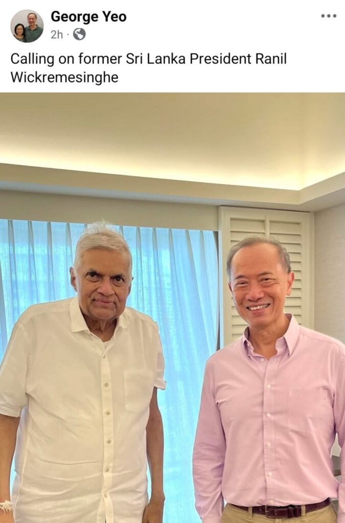 සිංගප්පූරුවේ හිටපු විදේශ අමාත්යවරයකු මෙන්ම, ආසියාවේ දේශපාලනය, ලෝක දේශපාලනය මෙන්ම චීන – ඇමෙරිකානු සබඳතා ගැන දේශන පවත්වන කීර්තිමත් චින්තකයකු ද වන George Yong-Boon Yeo, සිංගප්පූරුවේදී ප්රතිකාර ලබන ශ්රී ලංකාවේ හිටපු ජනාධිපති රනිල් වික්රමසිංහගේ සුවදුක් විමසීමට ගොස් තිබේ.