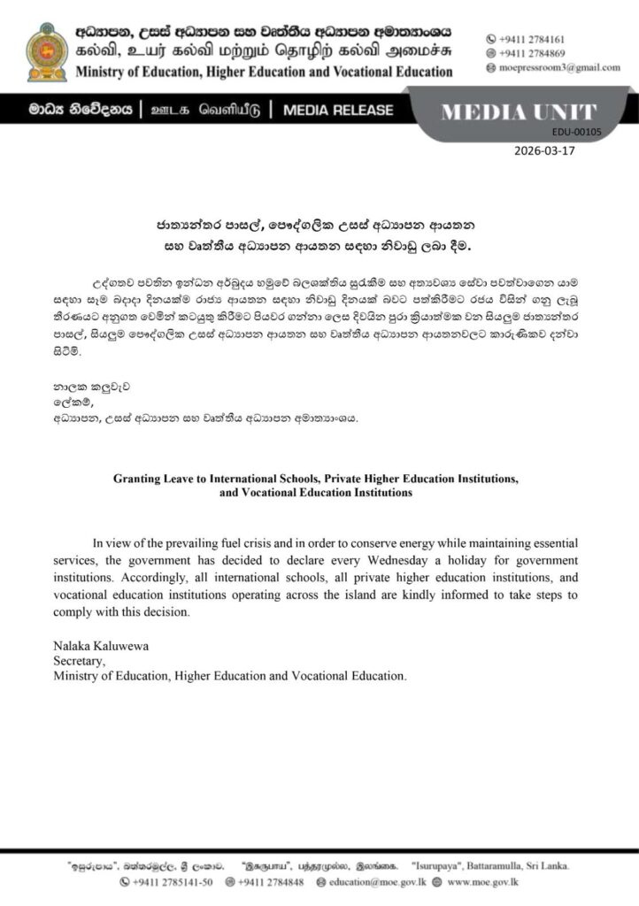 අධ්යාපන අමාත්යාංශය විශේෂ චක්රලේඛනයක් මගින් හෙට (18) සිට බදාදා දිනයන් හි රජයේ සහ පුද්ගලික සියලුම පාසල් වසා දැමිය යුතු බව නියෝග කර ඇතත් , එම නියෝගය නොසලකා කොළඹ බොරැල්ලේ පිහිටි B.S.C ((British School in Colombo) ජාත්යන්තර පාසැල හෙට විවෘතව කටයුතු කරන බව එහි විදුහල්පති දෙමාපියන්ට දන්වා තිබේ.