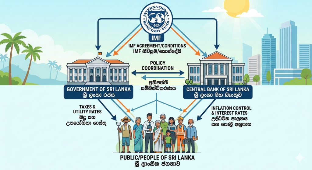 ත්‍රිකෝණාකාර හිරවීම, ජාත්‍යන්තර මූල්‍ය අරමුදල (IMF) කියන්නේ බදු වැඩි කරන්න කියලා, මහ බැංකුව කියන්නේ මිල පාලනය කරන්න කියලා, ජනතාව කියන්නේ සහන දෙන්න කියලා.