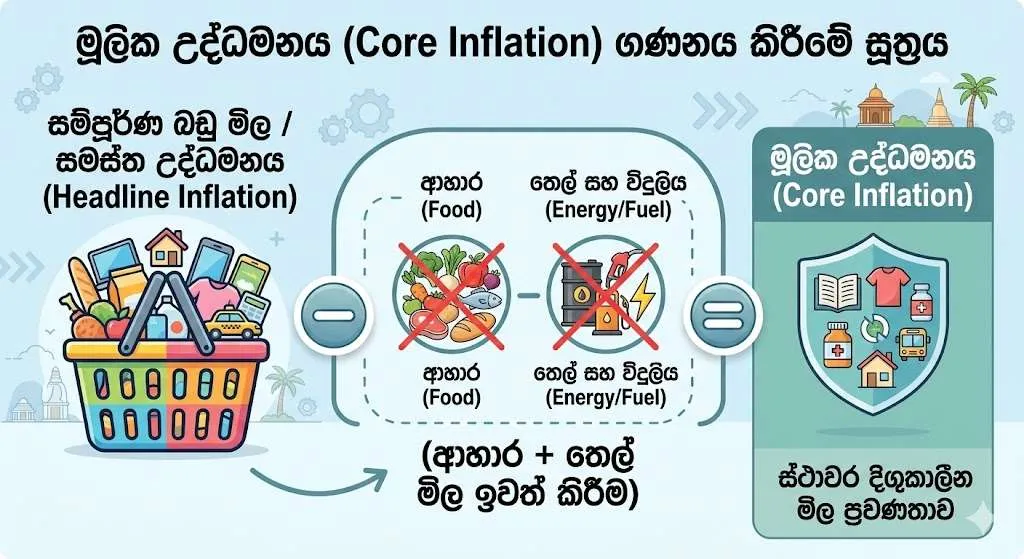 හොඳම දේ අයින් කරලා, උද්ධමනය මනින කොට අපිට එදිනෙදා වැඩියෙන්ම ඕන වෙන කෑම බීම (ආහාර) සහ තෙල්/විදුලිය (ඉන්ධන) අයින් කරලා බලන එකට තමයි “මූලික උද්ධමනය” කියන්නේ.