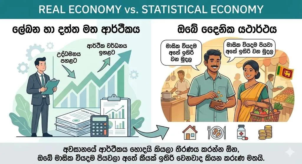 සංඛ්‍යාලේඛන කියන්නේ “වෙස් වලාගත් බොරුවක්”, නිලධාරීන් තමන්ට ඕන දත්ත විතරක් අරන් ආර්ථිකය හොඳයි කියලා පෙන්වනවා. හැබැයි පාරේ ඉන්න මිනිහෙක්ට බත් එකක් ගන්න තියෙන අපහසුව ඒ කිසිම රපෝර්තුවක ලියවෙන්නේ නැහැ.