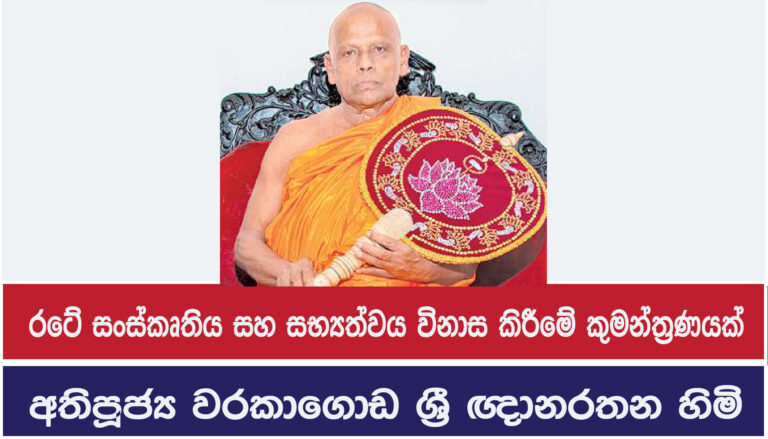 රටේ සංස්කෘතිය සහ සභ්යත්වය විනාස කිරීමේ කුමන්ත්රණයක් ක්රියාත්මක වෙමින් ඇතැයි අස්ගිරි පාර්ශ්වයේ මහනායක අතිපූජ්ය වරකාගොඩ ශ්රී ඥානරතන මහ නා හිමිපානන්...