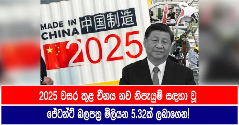 2025 වසර තුළ චීනය නව නිපැයුම් සඳහා වූ ජේටන්ට් බලපත්ර මිලියන 5.32ක් ලබාගෙන ඇති බව එරට ජාතික බුද්ධිමය දේපළ පරිපාලනය...
